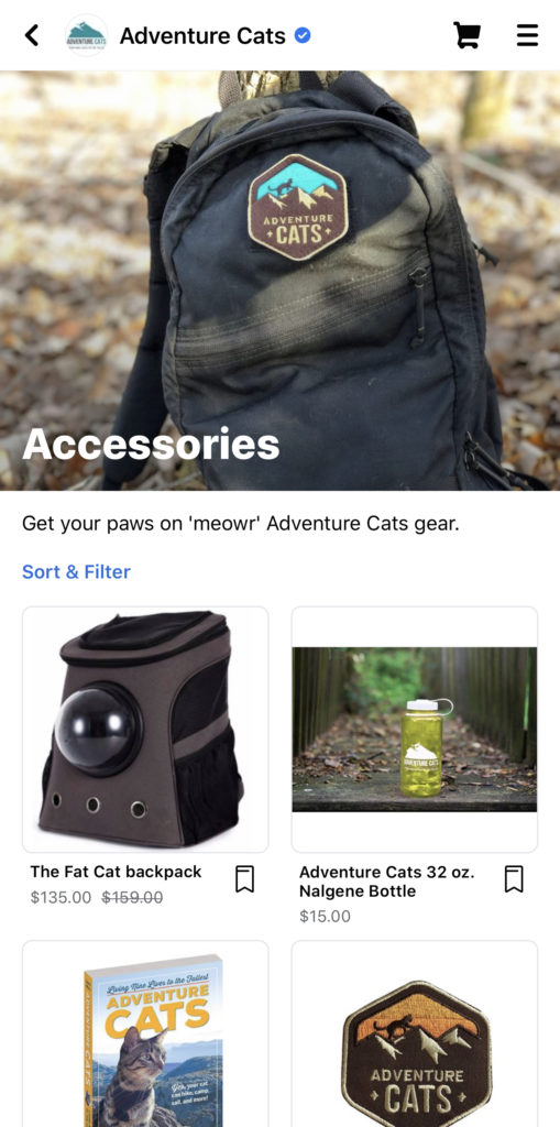 When your collections are approved and added to your shop, they’ll look similar to this example from the Adventure Cats Facebook Shop.
