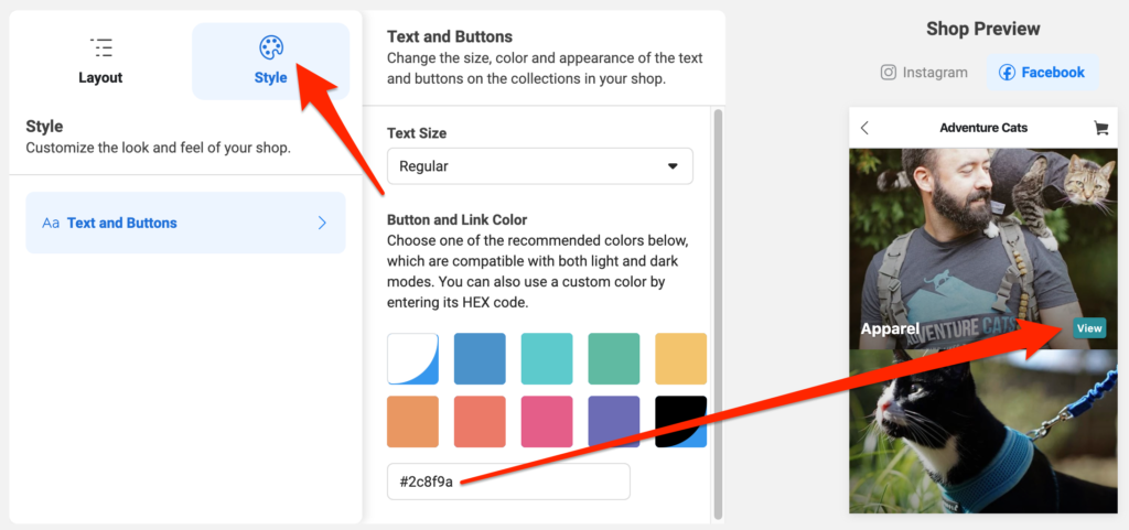 Here, you can select your shop’s text size, as well as the color of the buttons. Select one of the suggested colors, or enter a custom HEX code to match the exact color of your brand like Adventure Cats did.