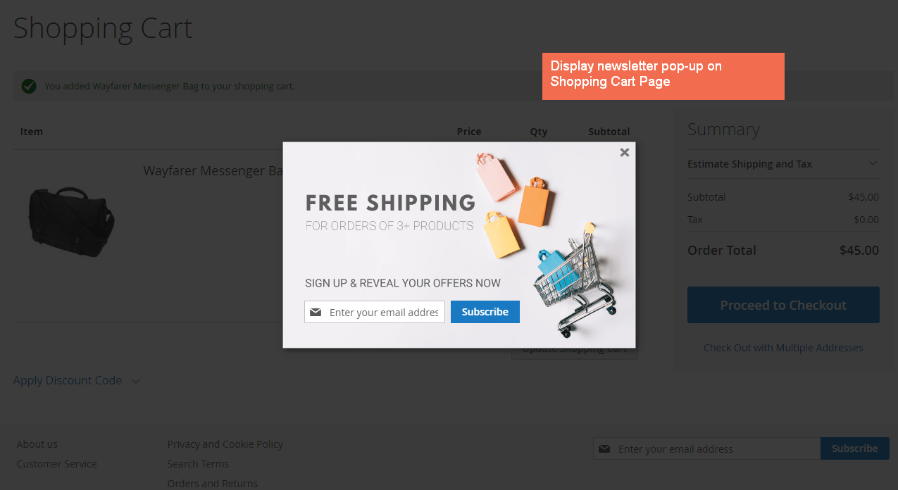 When to use: Use this option if there’s a large number of shoppers who add products to their carts, only to abandon them shortly afterward. Unexpected shipping costs may explain some of the abandonment. Use your lead magnet to promote free shipping and to ask shoppers to submit their email address to receive a code.
