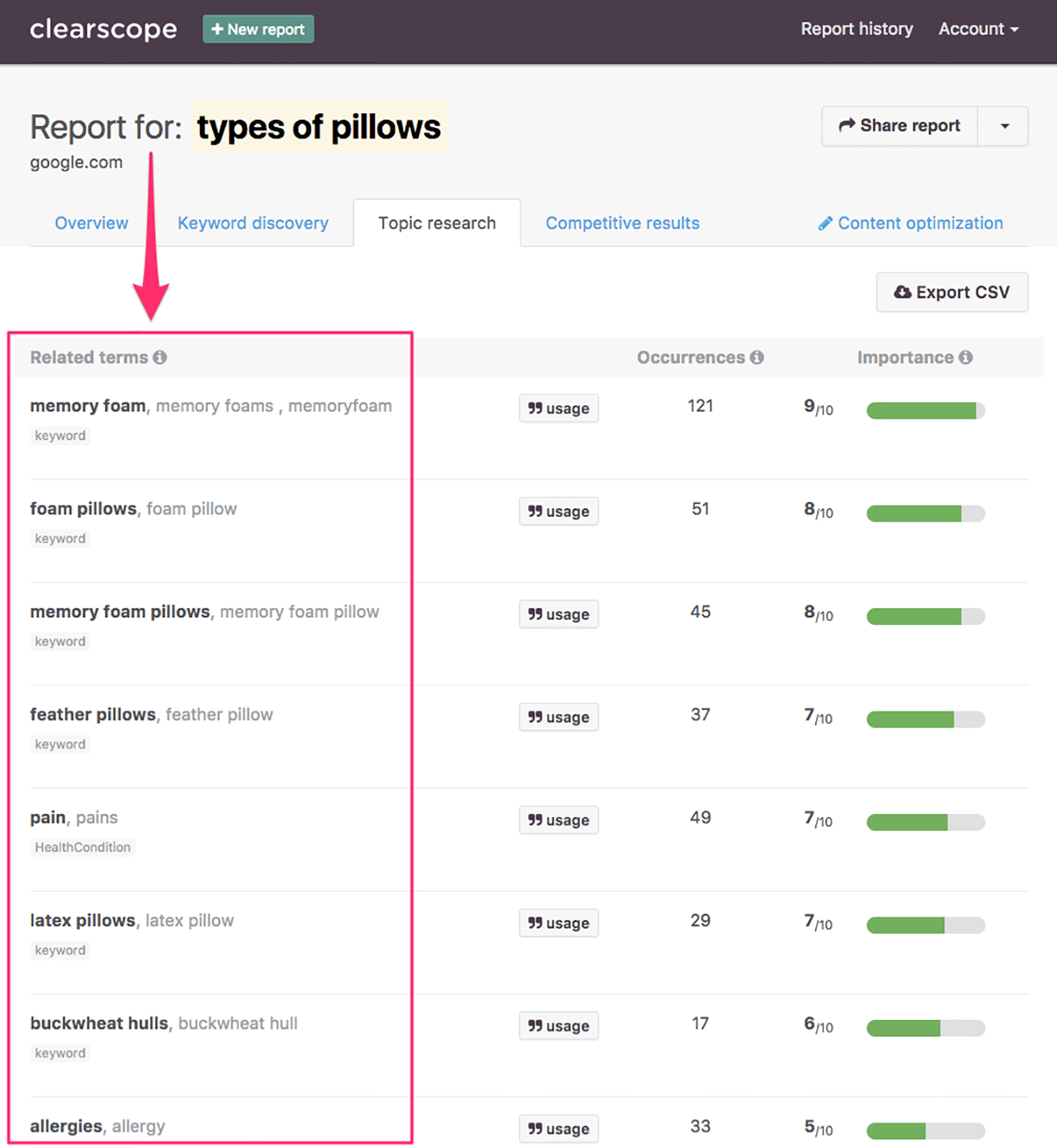 For example, say you own an online store for bedding and the keyword for your content is “types of pillows.” Clearscope returns the most commonly used phrases in the top 10 Google results for that keyword.